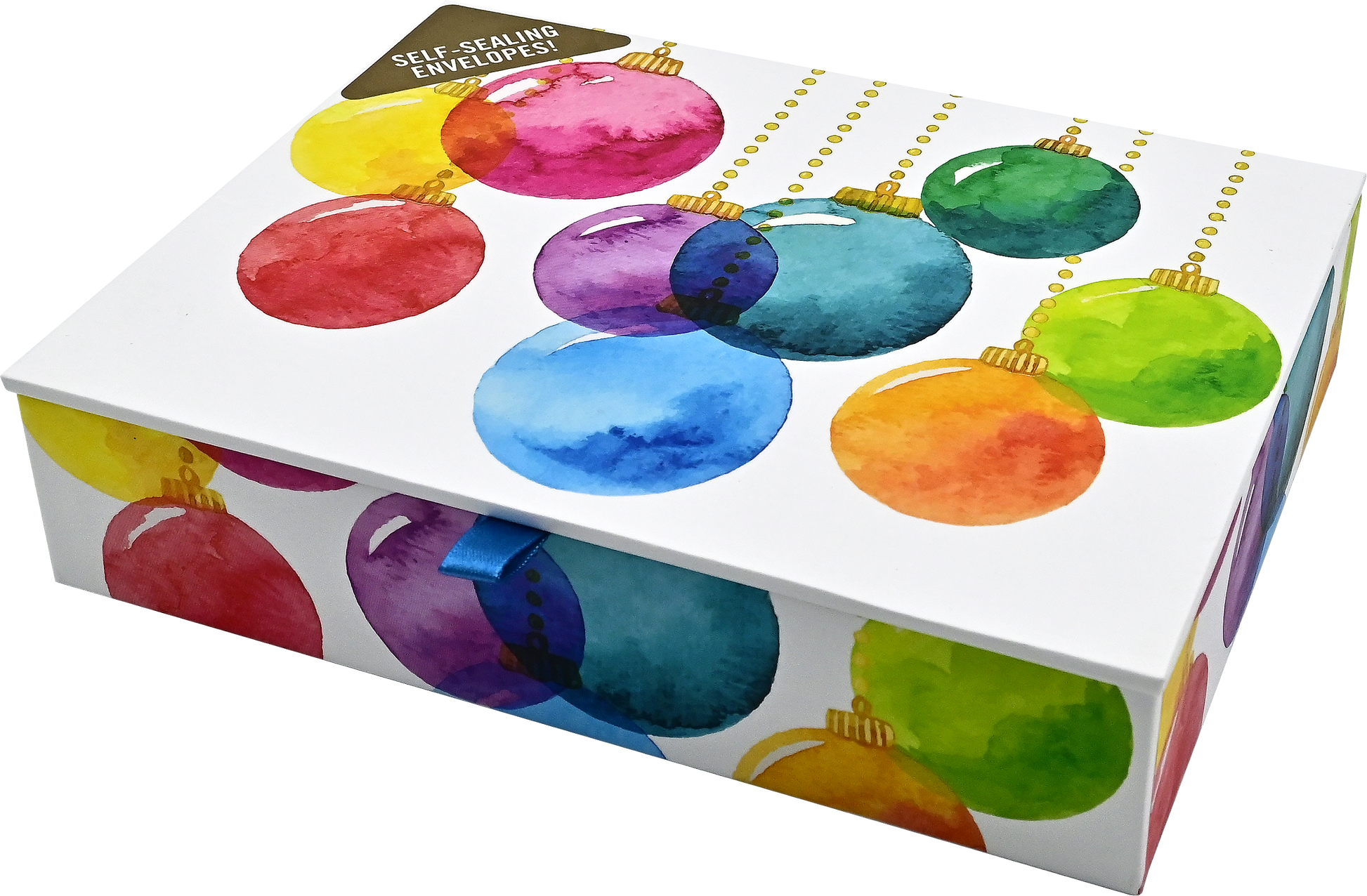 Airy ornaments in rainbow colors float across these vibrant greeting cards. Premium card set includes 20 cards, 21 envelopes, and a matching keepsake box. Larger cards provide ample space for personal messages. Smooth card interiors are uncoated. Quality card stock takes pen beautifully. Card design is embellished with touches of eye-catching gold foil. Inside greeting: Wishing you all the joy and wonder of the season White stationery envelopes are self-sealing for your convenience -- simply peel and stick. Sturdy reusable box features a reproduction of the card design on the lid. A smaller image is replicated inside. Box comes with a ribbon tab, ribbon hinge, and a magnetic closure. Perfect for storing notes, holiday mementos, postage stamps, and more! Cards measure 7'' wide x 5'' high.