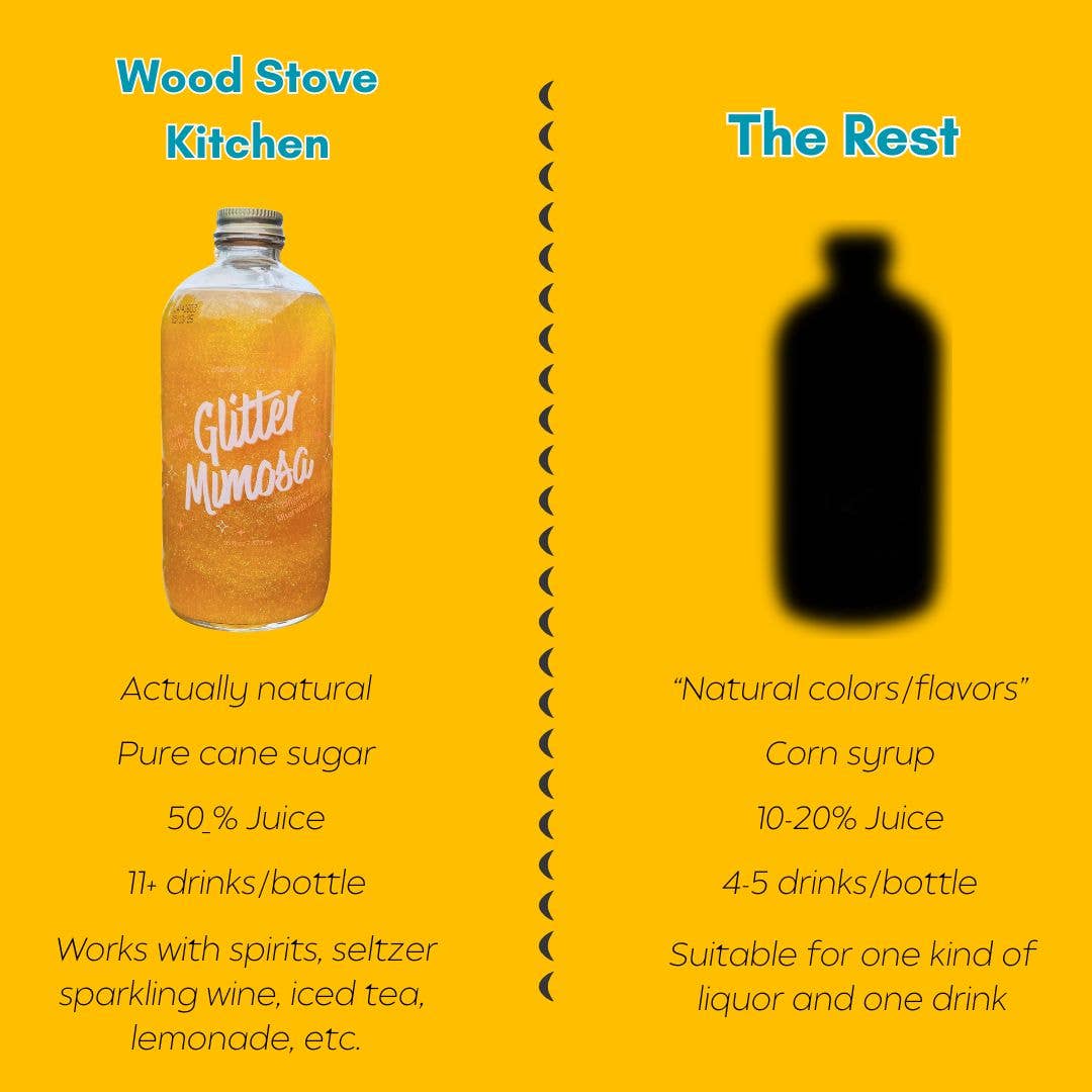 Get your sparkle on with our concentrated, glitter-infused Glitter Mimosa Mixer. It contains tangerine and mango in addition to FDA-approved edible glitter that is made from the mineral mica. There's absolutely zero micro-plastics or anything artificial. Just add 1/2 to 1 ounce of this mixer to a glass of sparkling wine or sparkling juice for a mimosa or "mock-mosa". Or follow our lead and add 1 ounce of this mixer to 1-2 ounces of white rum and a splash of seltzer on top for a fun, tropical cocktail.